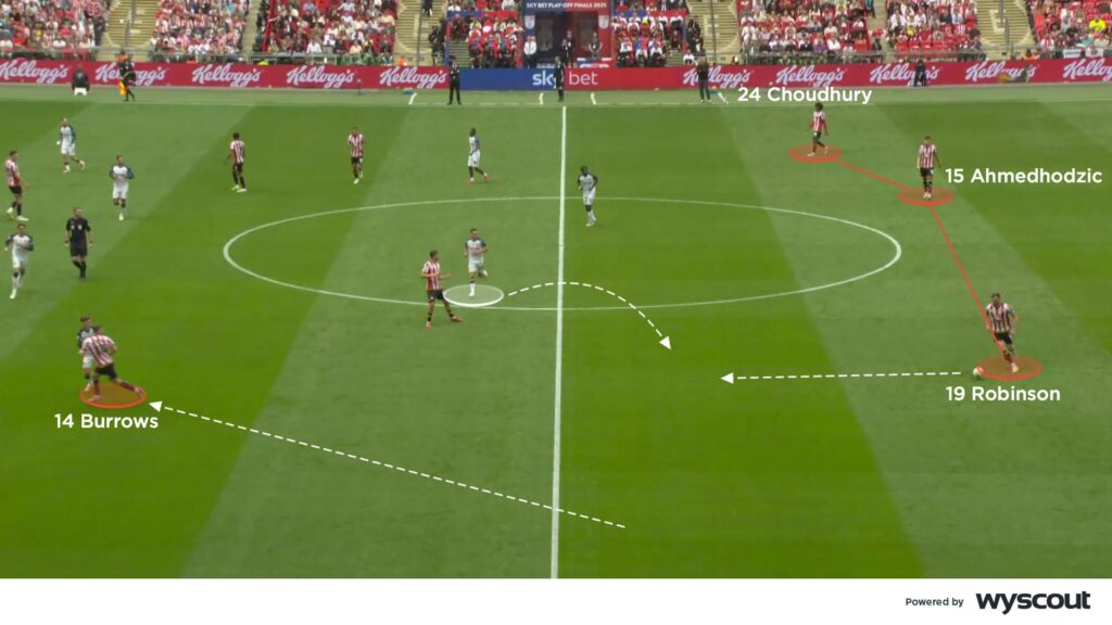 In the first half, Sheffield United left-back Burrows advanced high up the pitch when his team attacked Sunderland’s 4-4-2 block. By taking his direct opponent Chris Rigg with him, he created extra time and space for left centre-back Jack Robinson to step into midfield. The latter could then pick out forward passes, until eventually he was pressed by Enzo Le Fée. Burrows also worked well with left midfielder Gustavo Hamer, who offered wide when the full-back underlapped and vice versa. By contrast, United’s other full-back, Hamza Choudhury, barely advanced (below).