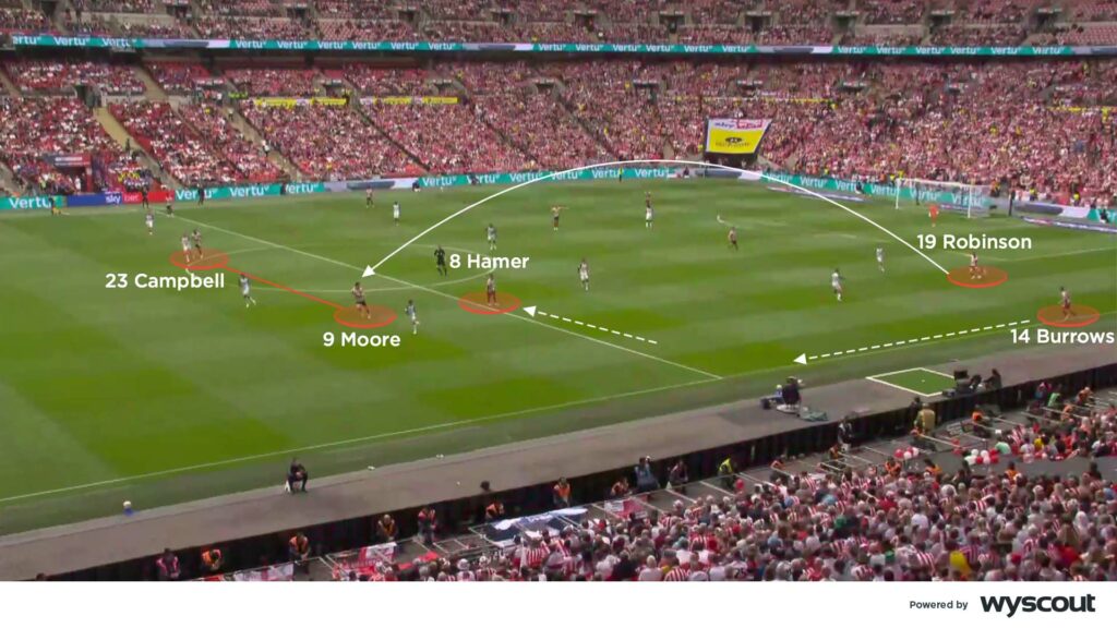 For United’s pinpoint longer passes into the front line – including passes from Robinson – Moore was the natural target. The number nine’s aerial duelling caused Sunderland’s back line significant problems in the first half. Hamer, meanwhile, narrowed from left midfield, ready to support underneath the front line while also creating space for Burrows to overlap from deep (below). The directness of Wilder’s team was evident in the opening goal, counter-attacking from defending a corner, with Tyreese Campbell finishing well in a 1v1.