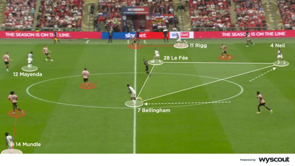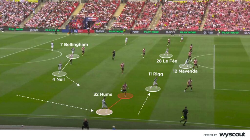 Le Bris made various attacking changes in the second half to try and get his team back in the game. First he shifted Sunderland to a 4-3-3 when attacking, with Bellingham released to work higher alongside Le Fée (below). Sunderland also attacked with quicker passes, finding their number eights and front line with purpose. Their shift in midfield stretched United’s two central midfielders, with Mundle subsequently getting regular 1v1s against Choudhury on the left. A winger was missing on Sunderland’s right side, however, until Patrick Roberts was added for Rigg on 58 minutes. That meant they could then attack both full-backs.