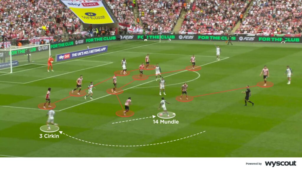 Left-back Dennis Cirkin advanced from the back line more as the first-half progressed. His diagonal runs inside drew his marker, freeing up a wide pass to winger Romaine Mundle (below).