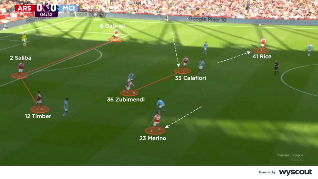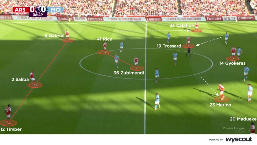 Arsenal showed variety with their movements on the left as they controlled possession early on. When Rice stayed alongside Zubimendi, Trossard dropped from his initial high and wide position on the left. Calafiori then advanced in his place to give Arsenal three players on the top line against City’s back four. Merino offered within the right inside channel as Arsenal controlled the ball with multiple short passes, largely between the back three and their two deeper pivots (below).
