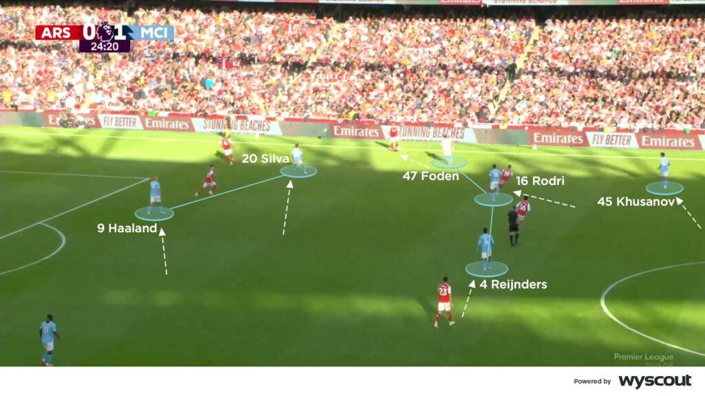 City mostly utilised a mid-block to defend. Haaland and Silva remained very deep – often goal-side of Arsenal’s pivots, so that the Gunners had four or five players in front of City’s first line of pressure. From this mid-block, City’s midfield unit narrowed, with Foden and Doku tucked in – the former especially narrow to deal with Arsenal’s left-side rotations (below). As a result, Arsenal were unable to penetrate City’s block, while Haaland’s goal gave the visitors a lead to protect.