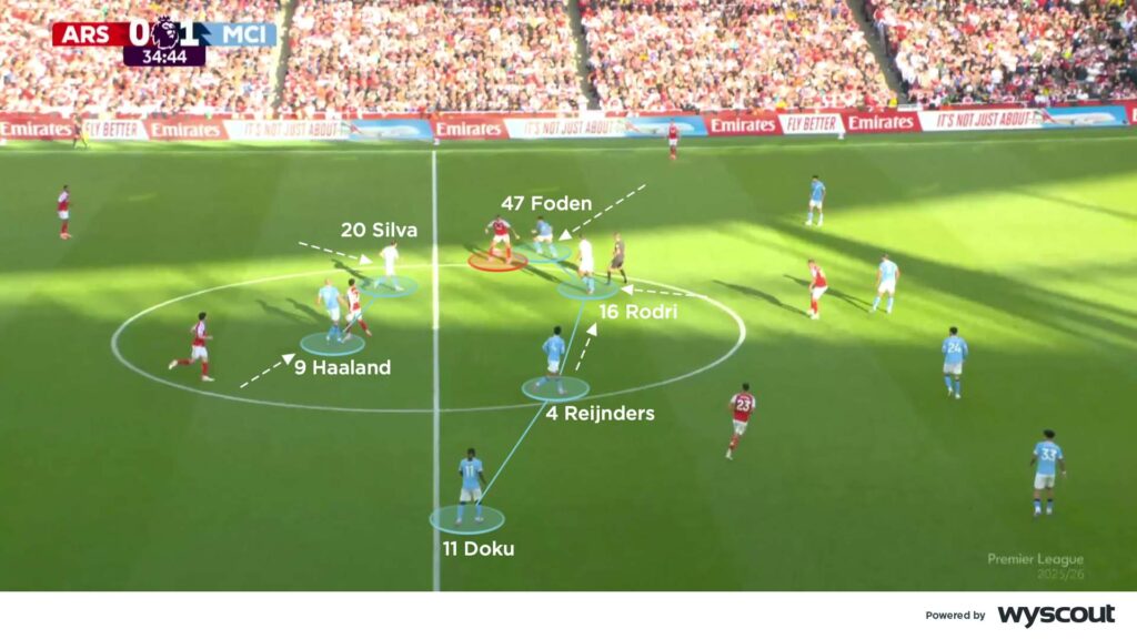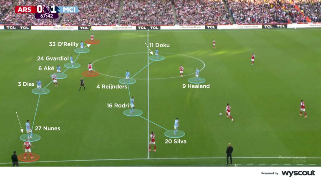 From City’s 4-1-4-1 in-possession shape, on defensive transition Bernardo Silva moved higher to join Haaland in the first line to defend in a 4-4-2. When City occasionally pressed high, Silva’s energy helped force the play wide and lock Arsenal to the touchline. Wide men Phil Foden and Jérémy Doku pressed outwards on their respective sides, with Rodri and Reijnders aggressively supporting from midfield. The full-back on that side provided further support, ready to jump on any attempted passes around City’s midfield four (below).
