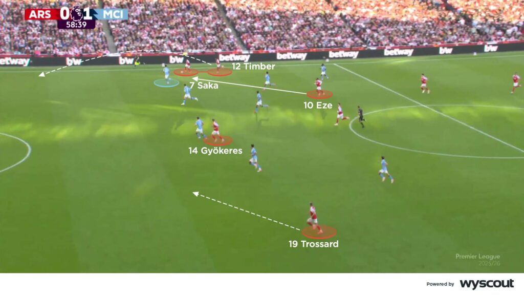 Arsenal continued to create and threaten on their right, with Timber much higher, much earlier, supporting Saka. Eze’s deft passing between lines helped work the ball into the penalty area, while Saka and Timber’s crossing posed City problems. Arsenal committed numbers from midfield, with Rice and Zubimendi making more forward runs rather than being required to stay deeper and make constant short passes. As a result, Doku was often forced all the way back to defend (below), limiting City’s best counter-attacking outlet for a period.
