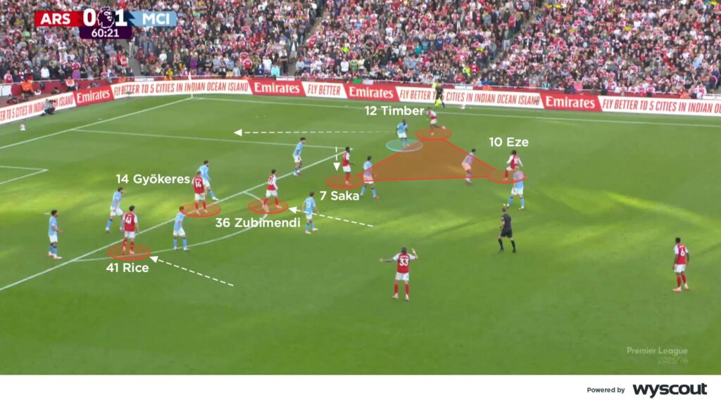 With Arteta introducing Saka and Eze for Madueke and Merino at the break, Arsenal immediately shifted to more purposeful and occasionally direct passing. Eze in the right inside channel was particularly influential, linking well with right-winger Saka. At times Arsenal attacked with fewer numbers than the first half, with Leandro Trossard and Viktor Gyökeres sometimes the only targets in the final third. But they had more forward-passing intent and penetrated more frequently. Rather than looking for central combinations, they got the ball to Saka and Eze, with Timber overlapping from deep as a third option on their right side (below).