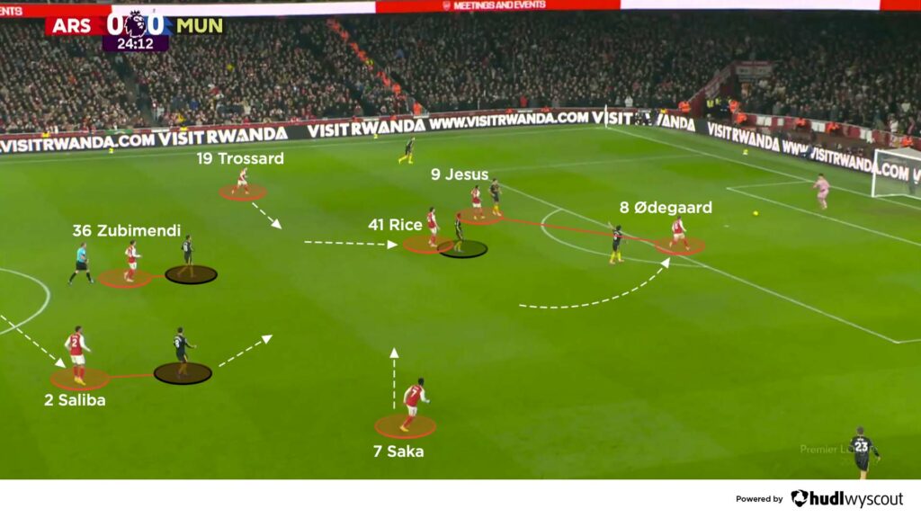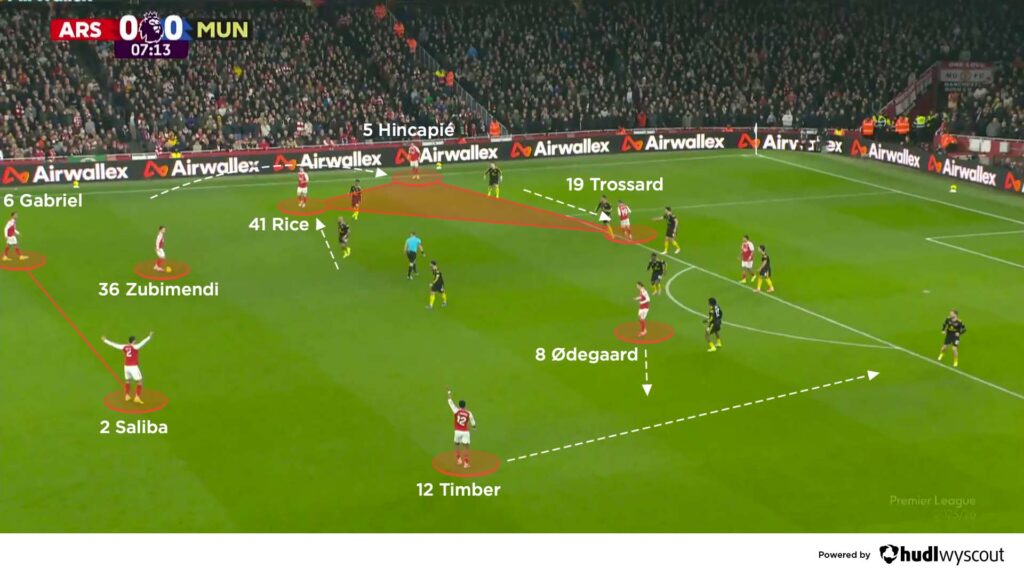 Arsenal were the dominant team for much of the opening 30 minutes, during which Declan Rice, Leandro Trossard and Piero Hincapié all rotated on their left, dragging Amad Diallo back to defend. Zubimendi supported ahead of Arsenal’s very high centre-backs, which helped to lock Manchester United into their own half.