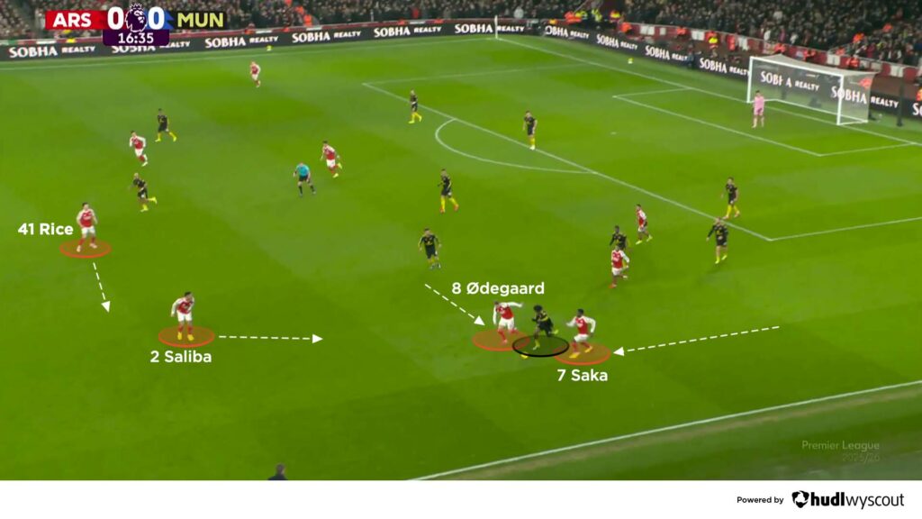 When pressing, Arsenal initially converted into a 4-4-2, with Ødegaard jumping to support alongside Gabriel Jesus as a first-line pair. Rice and Zubimendi then locked on to United’s double pivot, with one of Arsenal’s centre-backs aggressively following Bruno Fernandes – even when he began to drop very deep. Arsenal’s wingers being ready to narrow helped to choke the middle of the pitch (below), limiting United’s build and locking them into their own half in the opening 30 minutes.