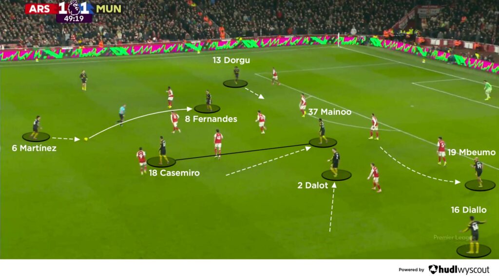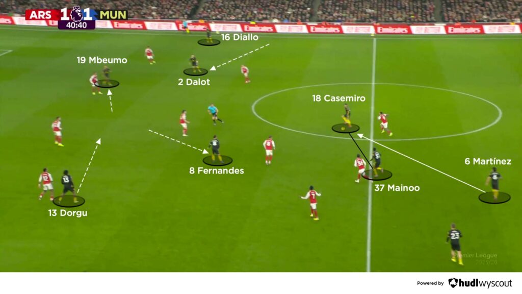 With Arsenal 1-0 up and seemingly in control, United achieved parity thanks to Mbeumo punishing Zubimendi’s error. Carrick’s team then looked to place central numbers between the lines where possible, with right-back Diogo Dalot moving inside as Diallo held the width. Fernandes roamed from his number 10 space, allowing Patrick Dorgu to make runs inside from his left-wing role. Mbeumo tended to drift away from the ball, creating more room centrally, while clever forward passing from Martínez in particular found United’s pivots (below). They linked nicely into teammates who rotated in the central spaces ahead, helping United to have sustained periods of possession.