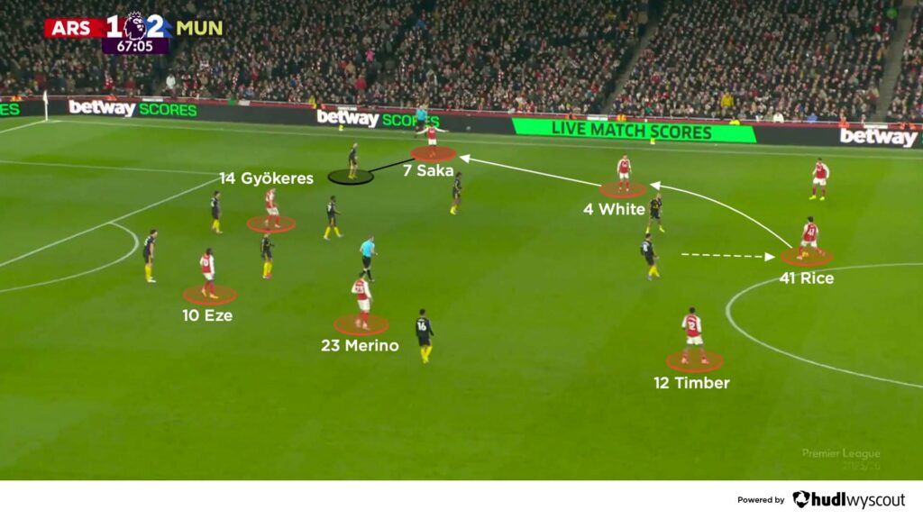 Arteta made four changes just before the hour mark in an attempt to revive Arsenal’s attack, with Eze, Merino, Gyökeres and Ben White on for Zubimendi, Ødegaard, Jesus and Hincapié after 58 minutes. Eze and Merino worked around Gyökeres, with Rice dropping deeper in his midfield role. Right-back White fed Saka in his continued 1v1 battle with Shaw, as Timber shifted to left-back (below) – a move that effectively nullified his attacking output. United then elected to defend in a low block, with the midfield unit extremely compact. This forced Arsenal around, from which the visitors had to defend crosses and corners.