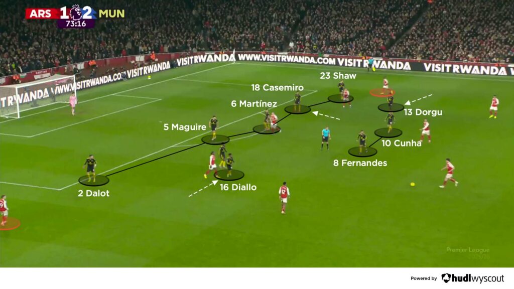 United started the second half as they ended the first, with lots of central numbers looking to receive between Arsenal’s lines. The home side were sloppy in possession, too, giving the ball away cheaply at times in their own half. For United, Dalot and Dorgu continued to move inside, with Martínez expertly feeding teammates between the lines. Mbeumo operated on the far shoulder of Arsenal’s centre-backs and linked with Diallo where possible, which allowed Fernandes and one of Casemiro or Kobbie Mainoo to move higher (below). Short, central combinations were crucial to United’s attacking approach, and preceded the long-range strikes for their second and third goals.