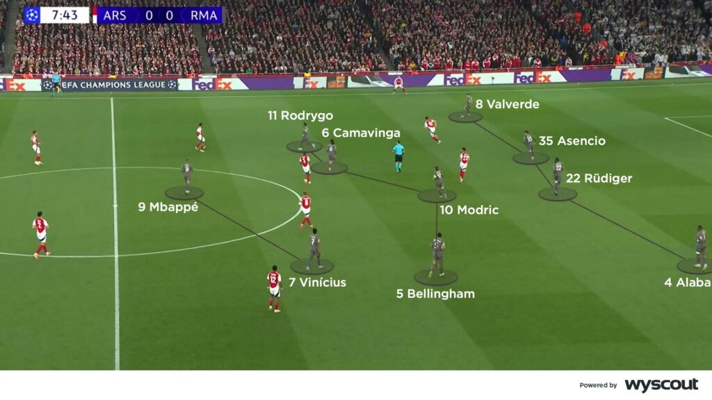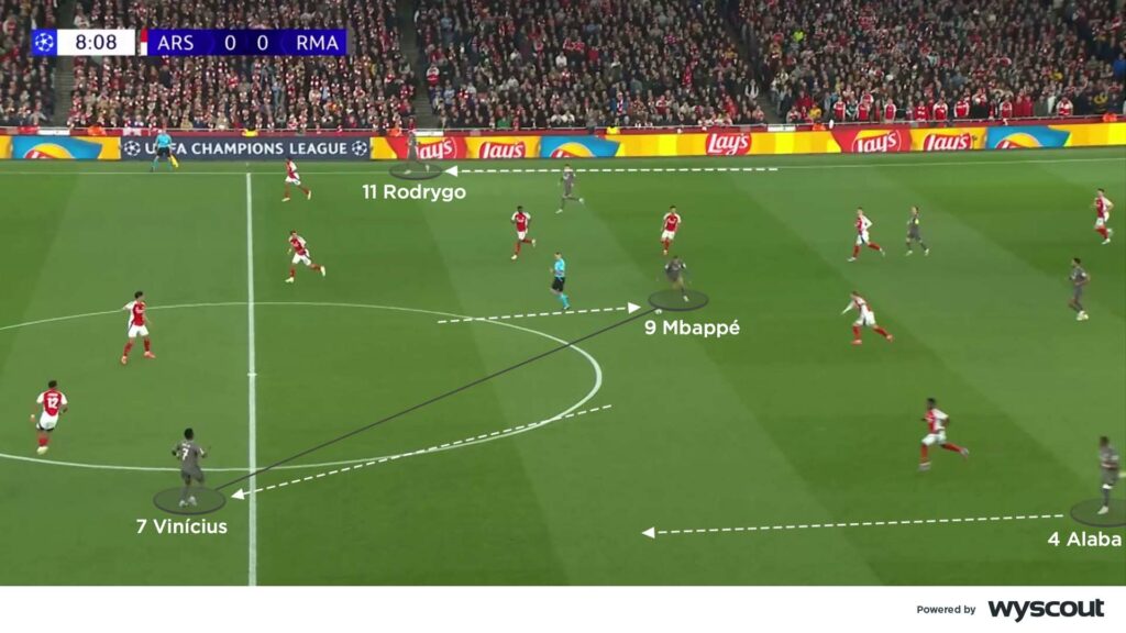 When Madrid regained possession in midfield or deeper, they had a clear plan to find Mbappé and Vinícius. The latter would instantly peel off towards Madrid’s left, aiming to attack Jurriën Timber 1v1. On this side, Alaba provided unselfish support with overlapping runs from deep, but was often ignored. Rodrygo held the width wide on the right, but he was rarely found on the counter, having come from a much deeper defensive position.