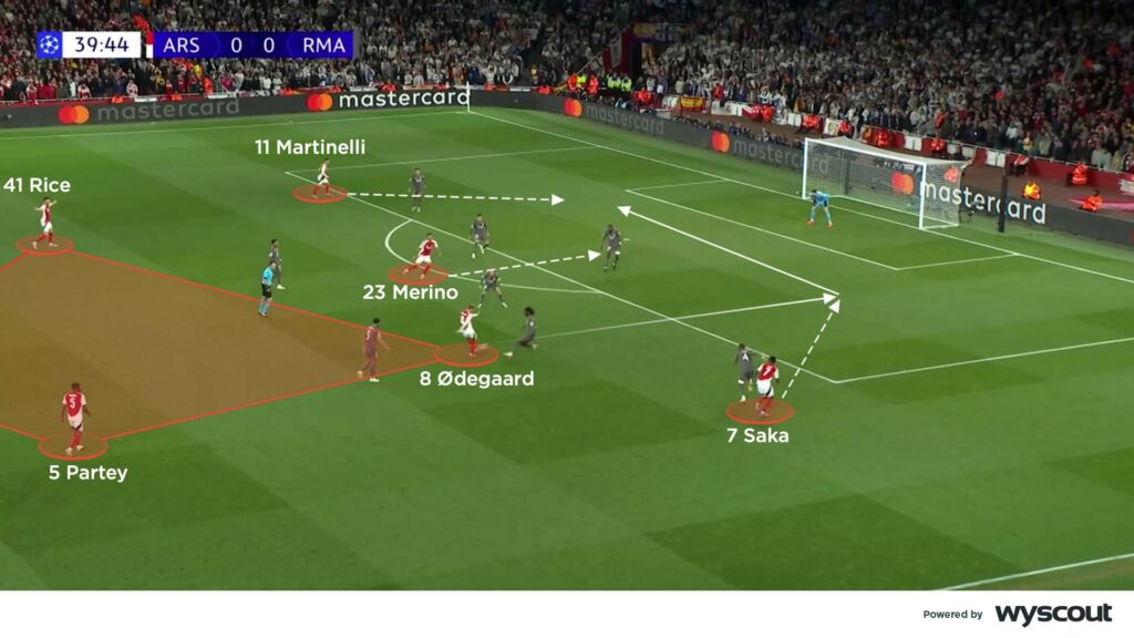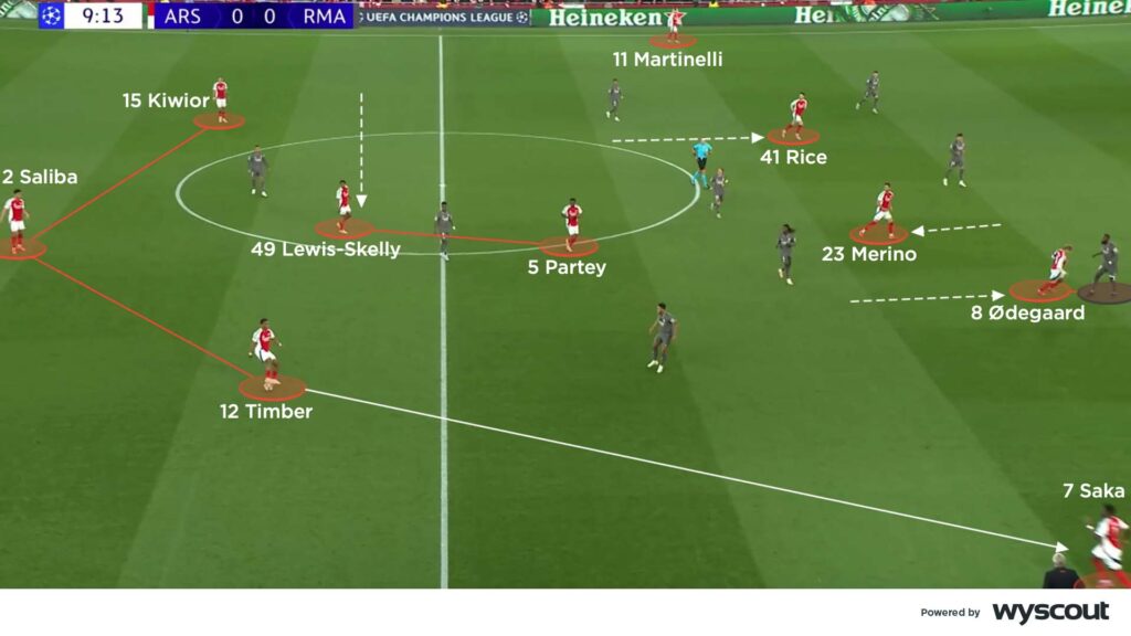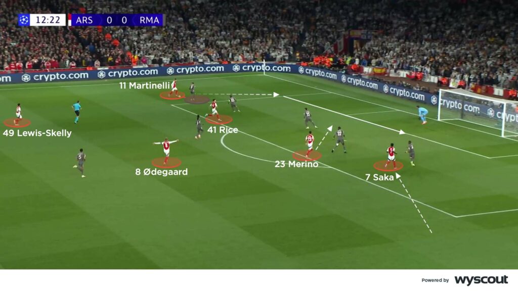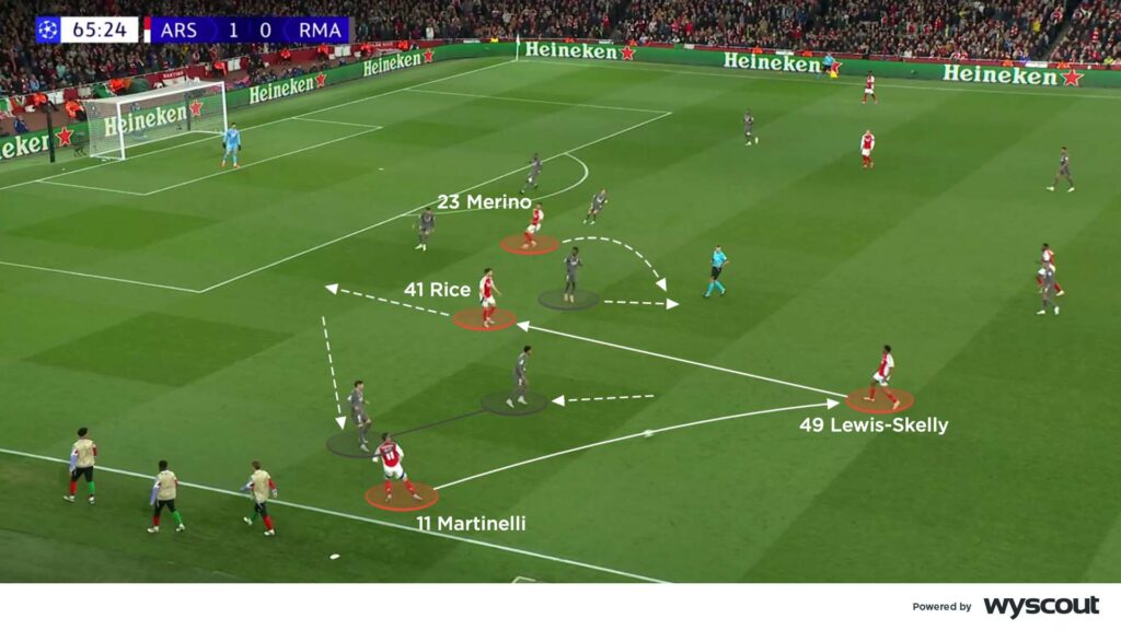 In response to Madrid’s defensive alterations, Arsenal effectively adapted their attacking combinations in the second half. With Madrid’s wide midfielders helping to double up on Martinelli and Saka, Rice and Ødegaard’s penetrative runs began to be tracked by Camavinga and Modric. This gave Arsenal’s double pivot, Partey and Lewis-Skelly, extra time on the ball. When Merino dropping occupied one of Madrid’s central midfield, it led to Rice in particular finding spaces to receive in the left inside channel (below). And it was connections on this side – with Lewis-Skelly inverting, Rice running forward, and Merino between the lines – that ended up combining for the third goal.