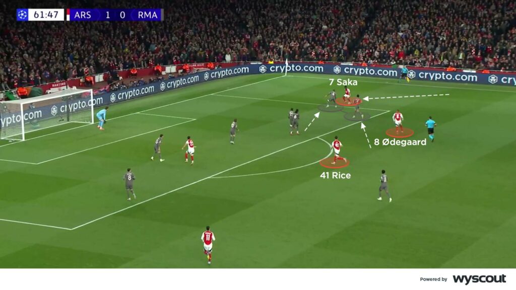 Although Arsenal’s box midfield continued to dominate, it took a little longer for a crossing threat to emerge on Saka’s side. Ødegaard dropped short and rotated with Timber almost as often as he ran forward. But when the Norwegian positioned himself higher to connect with the front line, Saka held the width for longer to receive wide or make runs in behind. From there, Arsenal’s right winger could attack 1v1 against either Alaba or the covering Bellingham (below). Saka then provided some superb driven crosses, but Arteta’s side lacked the presence of an attacker who could provide a simple touch towards goal.