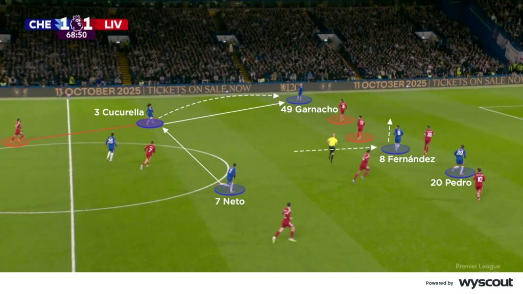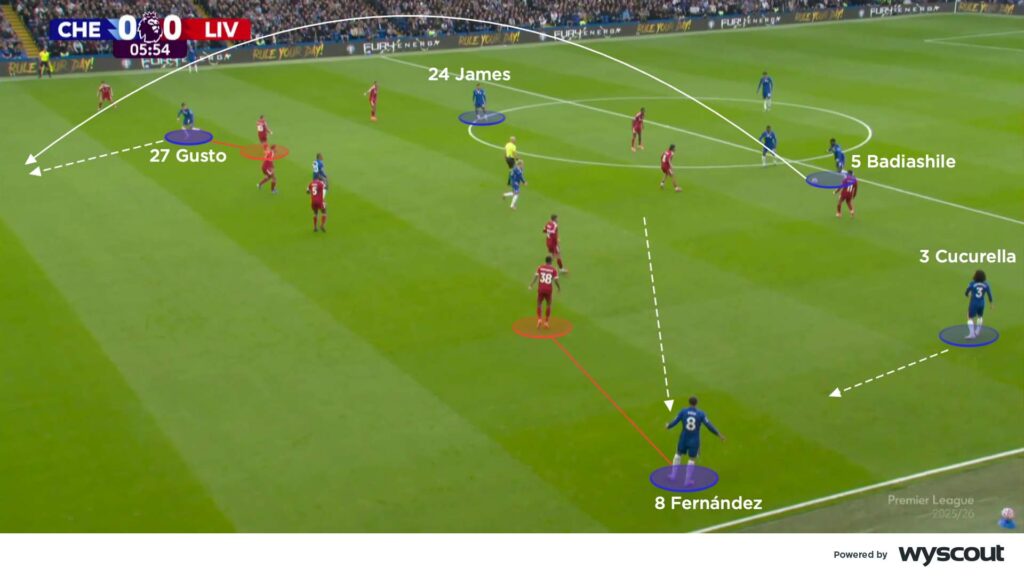 From their 4-2-3-1 structure, Malo Gusto broke forward as often as possible, joining Fernández as a number eight. Up against Liverpool’s 4-2-3-1, both positioned themselves very high, dragging their opposite number with them. On Chelsea’s right, full-back Reece James moved inwards to give Gusto more licence to attack high. On their left, Marc Cucurella provided overlapping runs to work around Fernández (below), especially when the latter moved higher in place of Alejandro Garnacho.