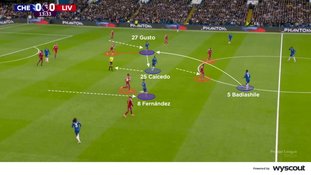 Chelsea’s use of high midfielders played a big part in their opening goal. Liverpool’s Szoboszlai looked to jump out from midfield and put pressure on the opposition’s centre-backs, leaving a free Chelsea midfielder. Starting high, both Fernández and Gusto dropped to the ball, late but fast, opening up bounce passes into a free and forward-facing Caicedo (below). When the pass from the back line was timed with these movements, Chelsea had a central base to attack from, as when Caicedo scored.