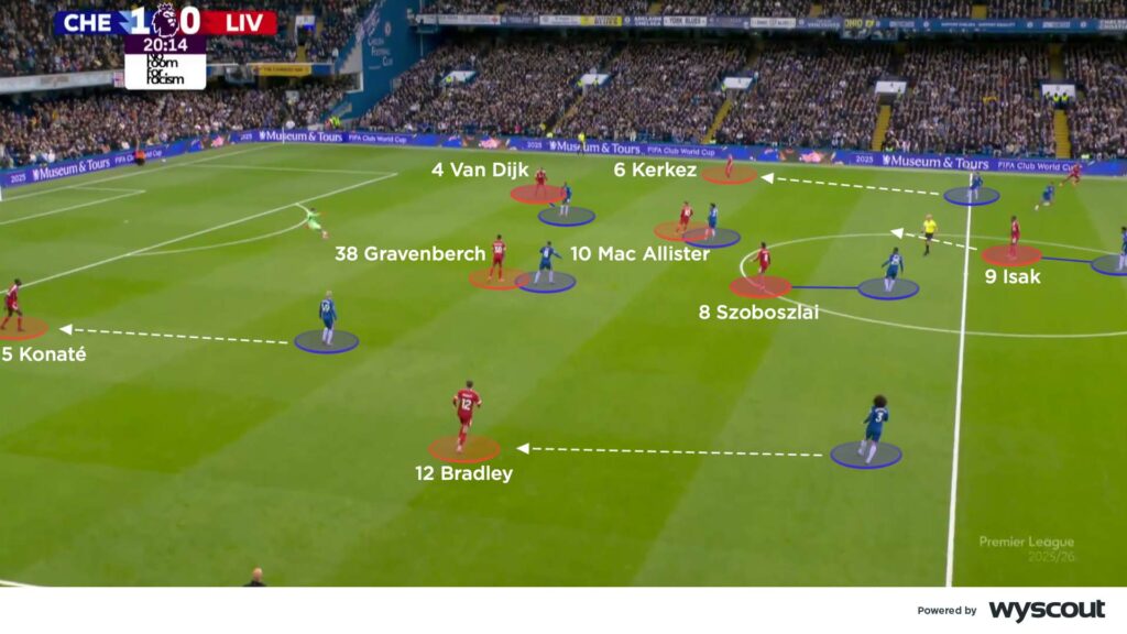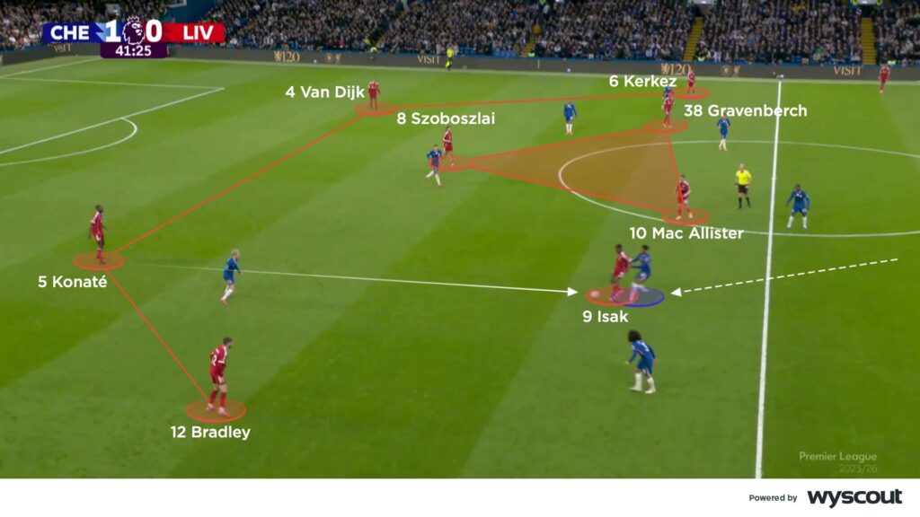 Chelsea were then quite content without the ball for periods of the first half, but still put aggressive pressure on Liverpool when appropriate. This usually stemmed from their left side, as Garnacho jumped on to Ibrahima Konaté, with Cucurella then following on to Conor Bradley. Liverpool initially struggled to progress as their central midfield three were covered man-for-man. Chelsea’s numbers limited Liverpool’s attempts to combine, so Alexander Isak began to drop deep (below) in an attempt to overload and help work the ball across the pitch as the main target player.