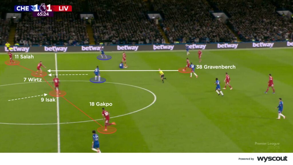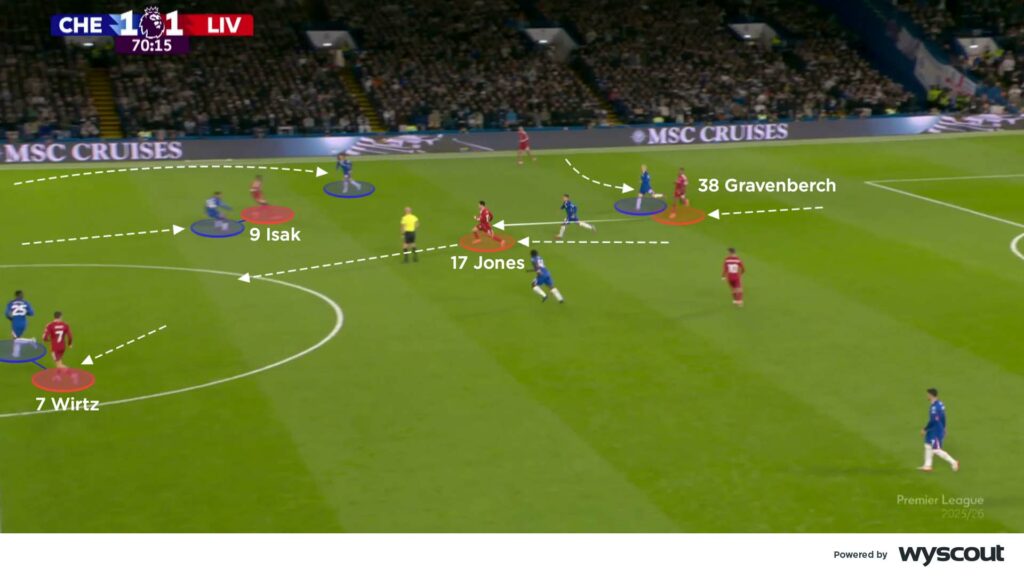 Chelsea continued to jump from their left side, with Cucurella sometimes leaving Salah free to attack the centre-backs, driving in on the angle from wide right. Gravenberch continued to outplay Garnacho’s inward press, linking with those ahead. When Wirtz was unable to connect due to Caicedo’s presence, Isak dropped as a decoy and Jones ran forward to receive and link with the front line (below). This coincided with Liverpool’s best period of the match, but they were unable to grab a second goal, despite creating strong final-third entries.