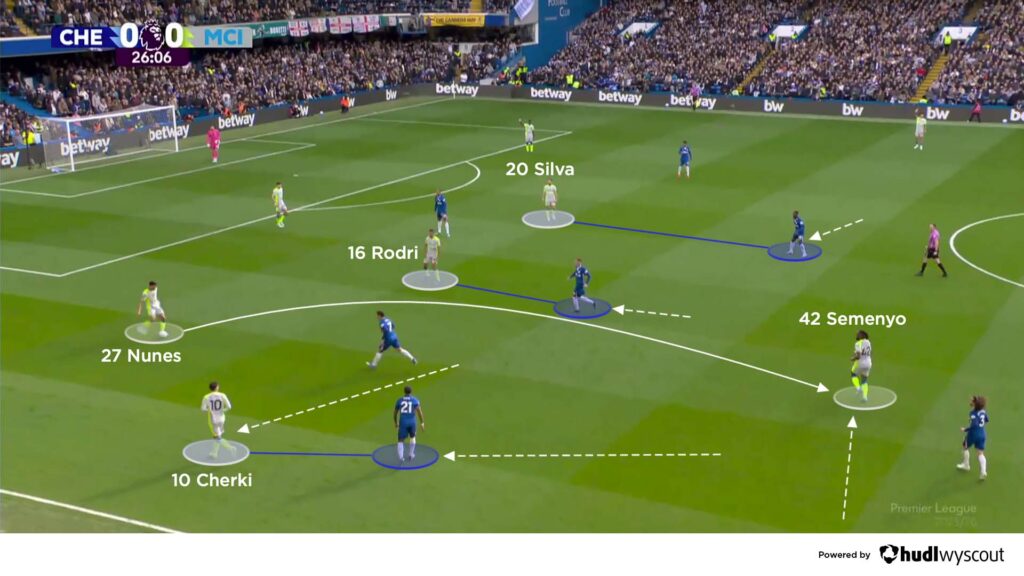 In the first half, most of Manchester City’s best attacking moments came via the wide areas. With Chelsea often pressing from right to left, City’s possession inside their own half was mostly focused around Rayan Cherki’s movements. When he was followed by centre-back Jorrel Hato, City’s number 10 dropped and widened to combine with Antoine Semenyo – or he acted as a decoy for the back line to play into Semenyo, skipping the tightly marked double pivot of Rodri and Bernardo Silva (below). Alternatively, the away side played over and into Erling Haaland to hold and link play, as he drifted over to City’s right.