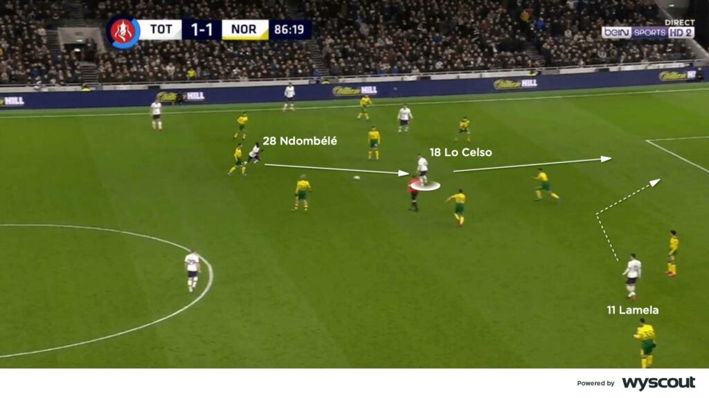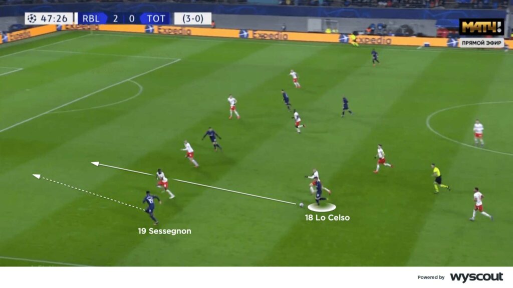 He also has the valuable ability to exploit spaces in between the lines while doing so. If he is in possession in those pockets of space he can both spot and execute forward passes to those running in behind, and he is able to play incisive balls towards them (below), which has become particularly crucial since the departure of Christian Eriksen, previously Tottenham’s main creative influence. The more his teammates have found Lo Celso in those positions, the more threatening they have become.