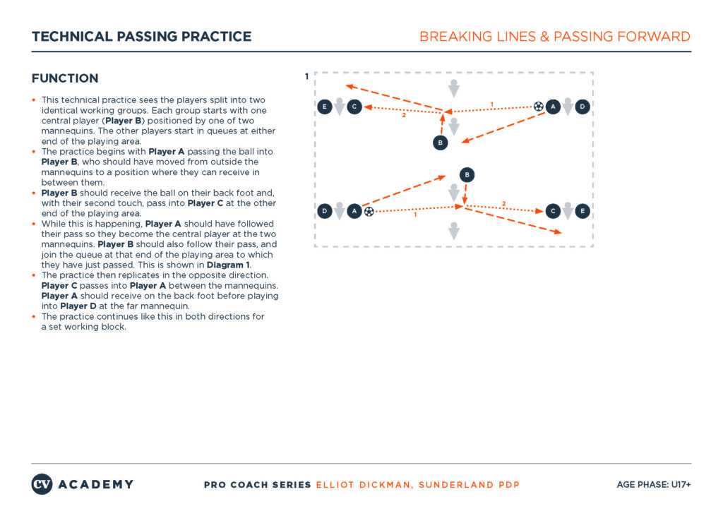 The video below features a technical passing practice delivered by John Hewitson, then Under-18 coach at Sunderland, as part of an exclusive coaching course for Coaches’ Voice. The practice set-up, details of which are included below the video, encourages players to work on their pass detail, timing and movement to receive, scanning and first touch – all key elements when successfully breaking lines.