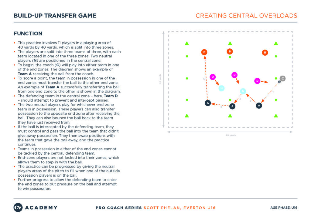 The video below features a build-up transfer game delivered by Scott Phelan, then lead Under-16 coach at Everton, as part of an exclusive coaching course for Coaches’ Voice. The practice set-up, details of which are included below the video. Encourages players to work on the ball speed of their penetrative passes, patience in possession, attracting pressure, using a pivot player to progress and body shape to receive – all key elements in successfully breaking lines.