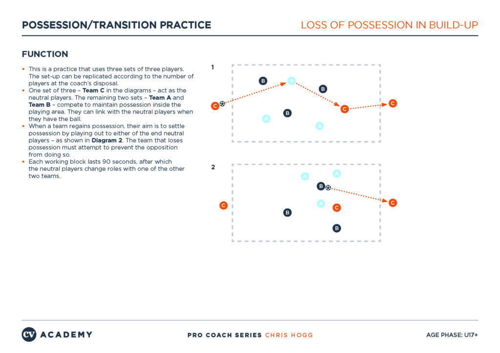 The video below features a possession/transition practice delivered by UEFA Pro Licence holder Chris Hogg when he was coach of the Newcastle United Under-23 team, as part of an exclusive coaching course for Coaches’ Voice. The practice set-up, details of which are included below the video, encourages quick and aggressive reactions to a loss of possession.