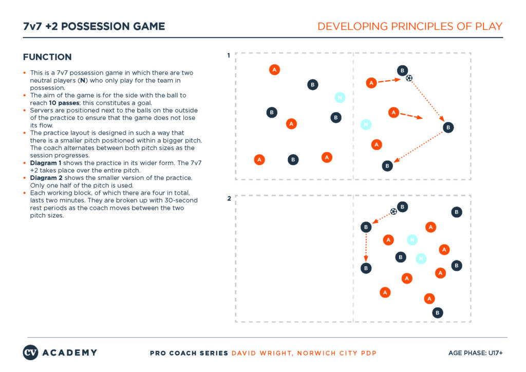 The video below features a possession game delivered by professional development phase coach Alan Neilson, as part of a wider Coaches’ Voice session led by then Norwich City Under-23 head coach David Wright. Details of the practice set-up are included below the video; with each team requiring 10 consecutive passes to earn a point, both are encouraged to counter-press with immediate intensity and intelligence upon a loss of possession.