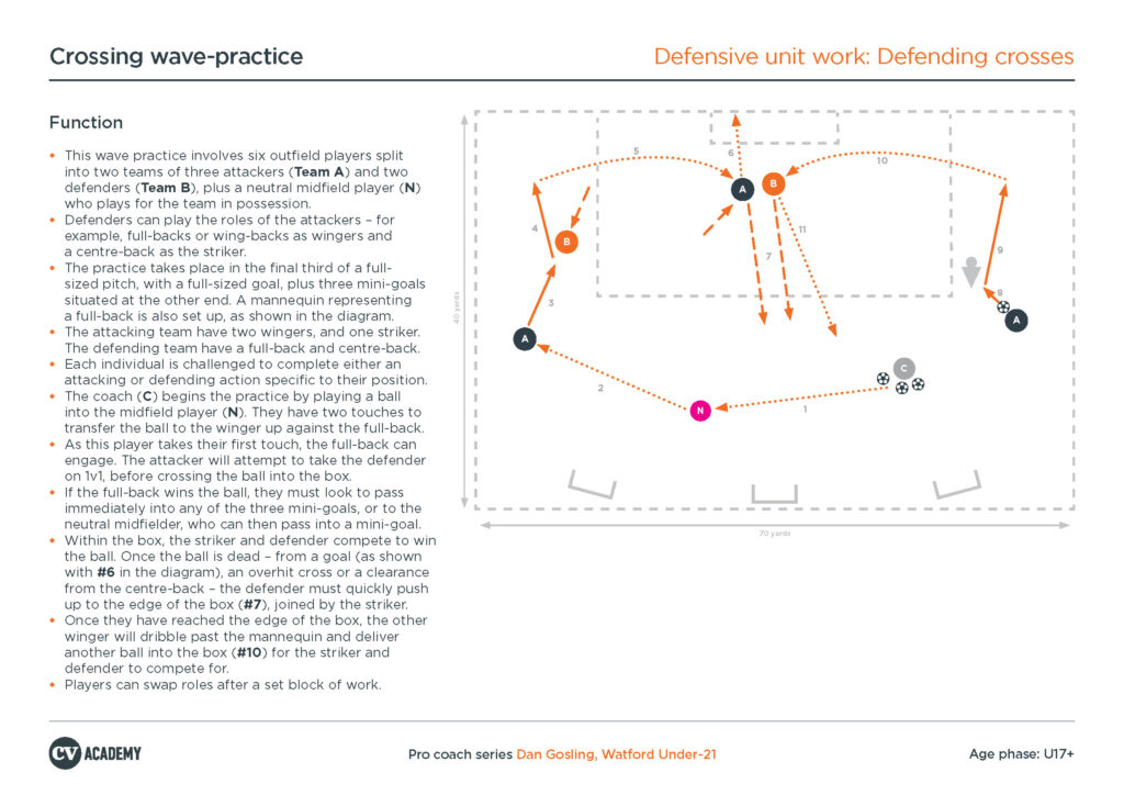 The video below features an individual development and unit practice that is focused on defending crosses, led by then Watford Under-21 assistant coach Dan Gosling. This includes attempting to prevent crosses at source, as well as defending different types of cross in the penalty area. Gosling coaches correct defensive body position, the importance of contact with attackers, and detail on clearances.