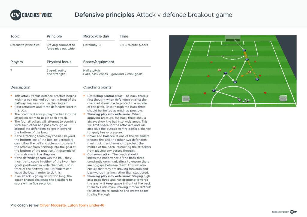 The video below features an attack-v-defence breakout practice, led by Luton Town Under-15 head coach and Under-16 assistant coach Oliver Modeste, which focuses specifically on a back three and their ability to stay narrow and compact and force opposition attacks into wide areas. Modeste coaches the players to communicate within, cover and balance their defensive line, to prevent gaps and the opposition playing through.