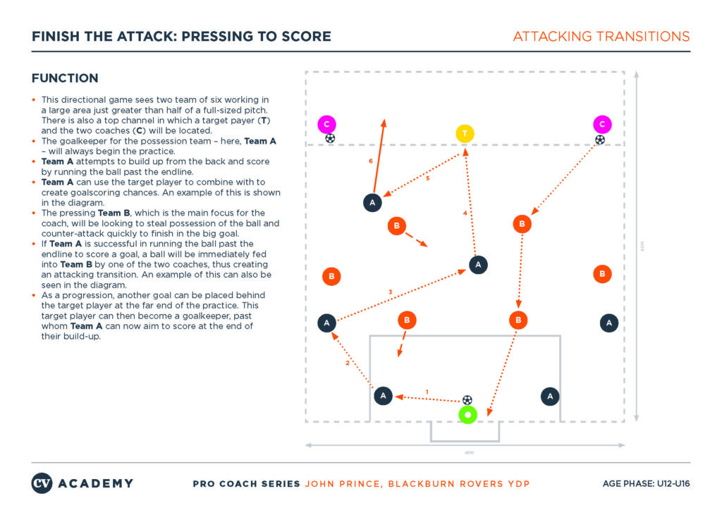 The video below features a 6v6 practice delivered by John Prince, then the senior youth development phase coach at Blackburn Rovers. One team must try to play out from the back and run the ball over a target endline, while the out-of-possession team – which is the coach’s main focus – should press, win the ball and attack quickly to score in a full-sized goal. Details of the practice set-up can be found below the video.