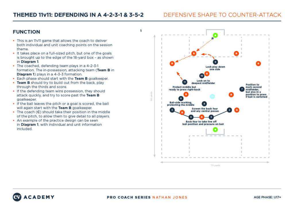 The video below features an 11v11 practice delivered by Nathan Jones to a group of Bournemouth Under-21 players. In the practice, Jones sets up an out-of-possession team to press high and aggressively from a 4-2-3-1 formation, focusing on the individual and unit responsibilities in an attempt to win the ball high. Details of the practice set-up can be found below the video.