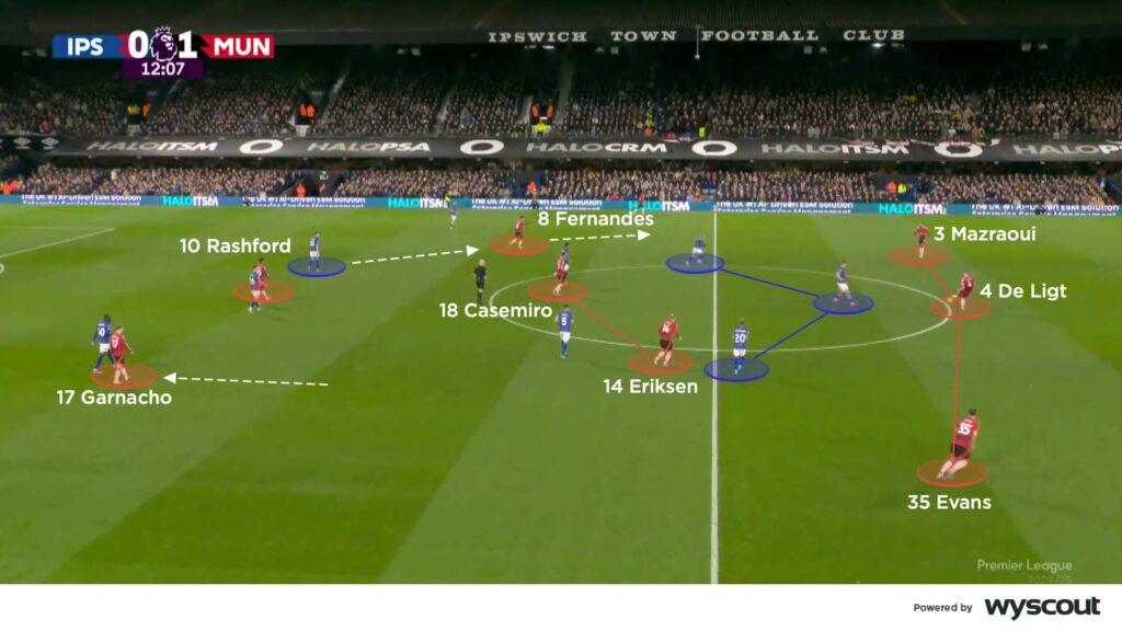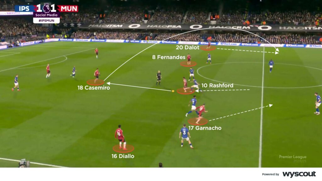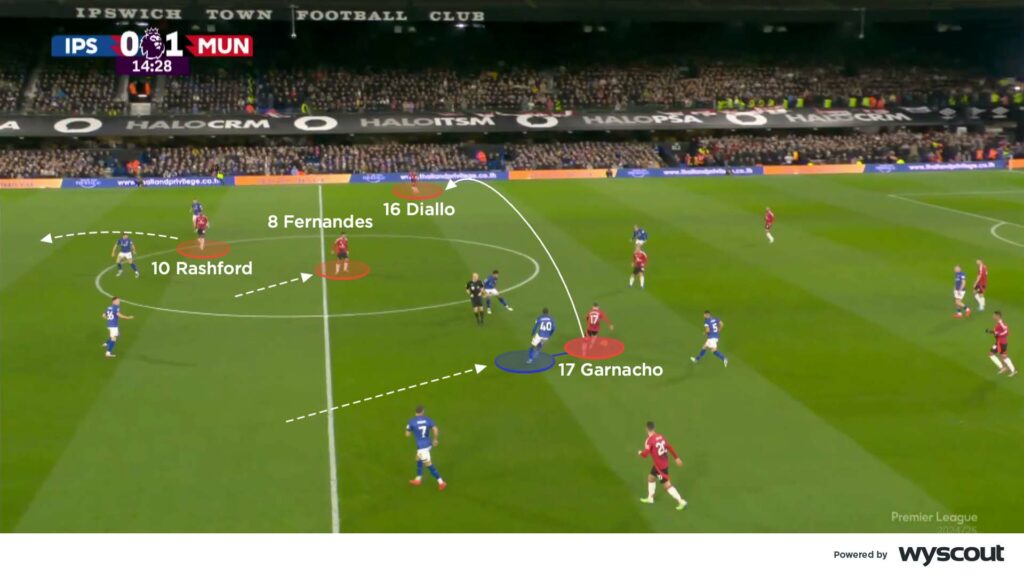 Although Ipswich’s press was more effective against United’s left side – largely due to Dalot not being as effective 1v1 as Diallo – there were still moments where Garnacho dropped to link with Dalot and Casemiro. Switches of play then helped United to keep accessing their right inside channel. With Axel Tuanzebe moving out of Ipswich’s back line to track Garnacho, the remaining back three held their position. Fernandes and Diallo could then combine, with Rashford ready to penetrate beyond (below).