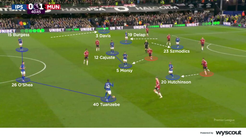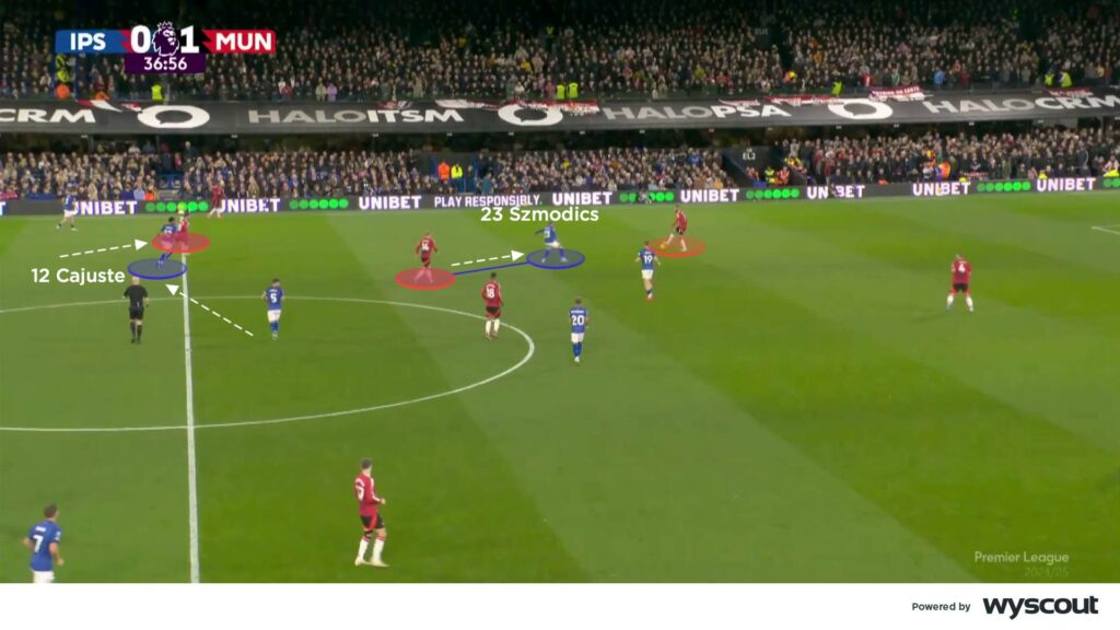 McKenna and Ipswich responded to their issues with United’s right side by adapting their high press. Sammie Szmodics continued to jump on to United’s right-sided centre-back, Noussair Mazraoui, but switched to pressing outwards and screening potential passes into United’s closest pivot, Christian Eriksen. Jens Cajuste – the central midfielder on Szmodics’ side – could then readjust, taking care of Fernandes’ dropping movements (below). From here, the Ipswich back line could stay intact, with both centre-backs in more comfortable positions.