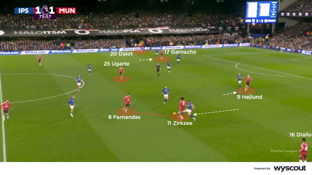 United then attempted to combine more through the centre. Manuel Ugarte replaced Casemiro after 56 minutes, followed by Joshua Zirkzee and Rasmus Højlund on for Eriksen and Rashford, respectively, after 68 minutes. Fernandes started to drop when United were in possession, acting as an initial second pivot alongside Ugarte. Zirkzee also dropped to combine and connect, with Garnacho higher – as in the first period – and wing-backs Diallo and Dalot holding the width. With Højlund on, United played into their Danish forward, who held and secured possession, before combining with central runners. This meant United could play forward, although this was sometimes with uncontrolled, longer passes.