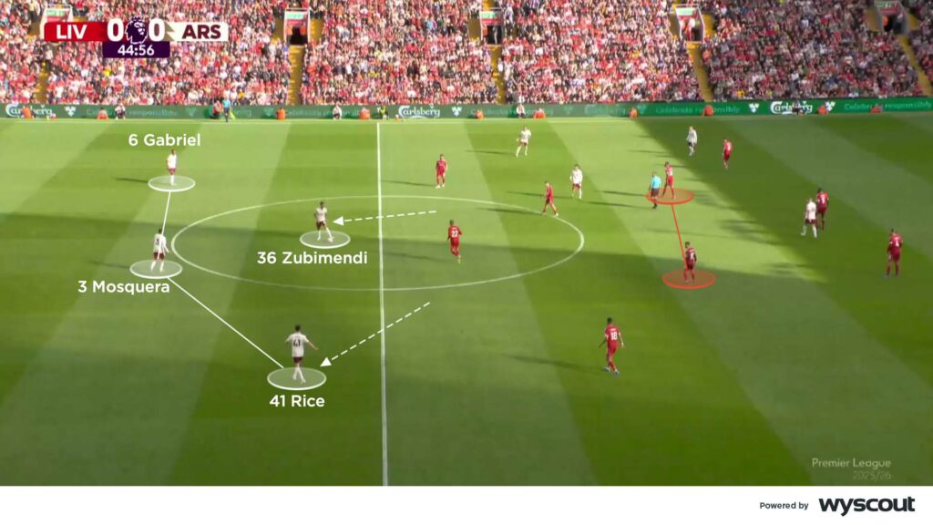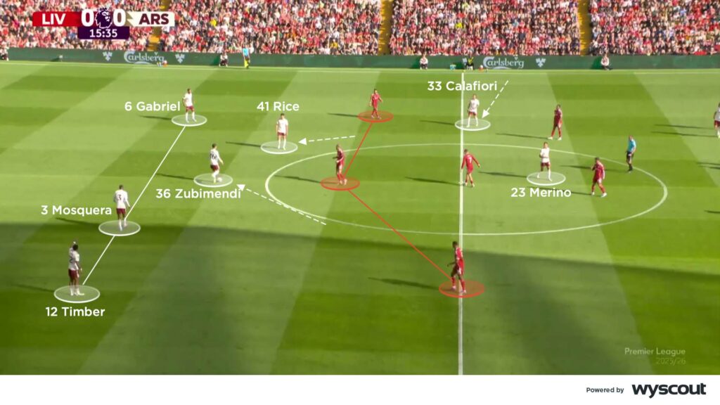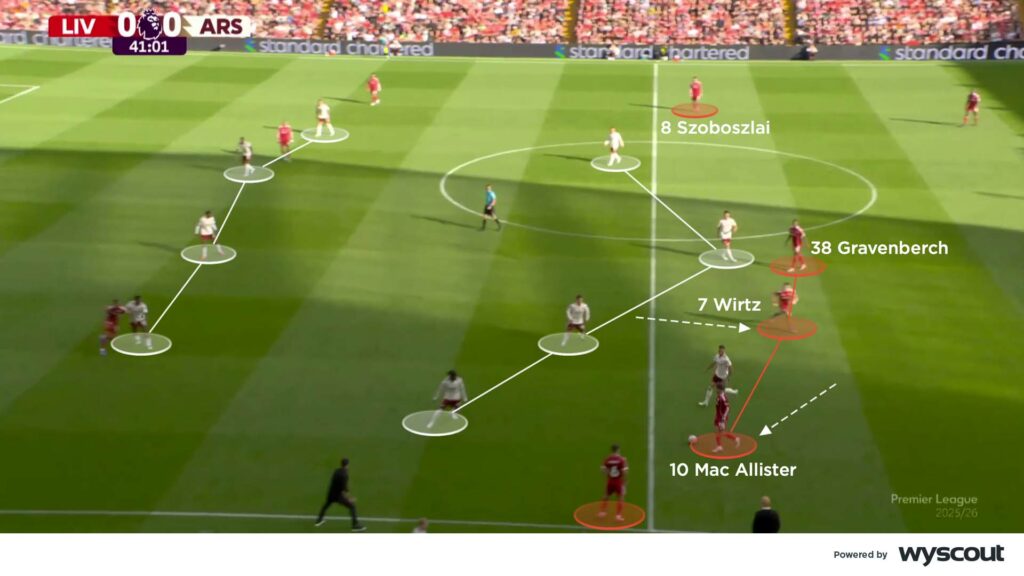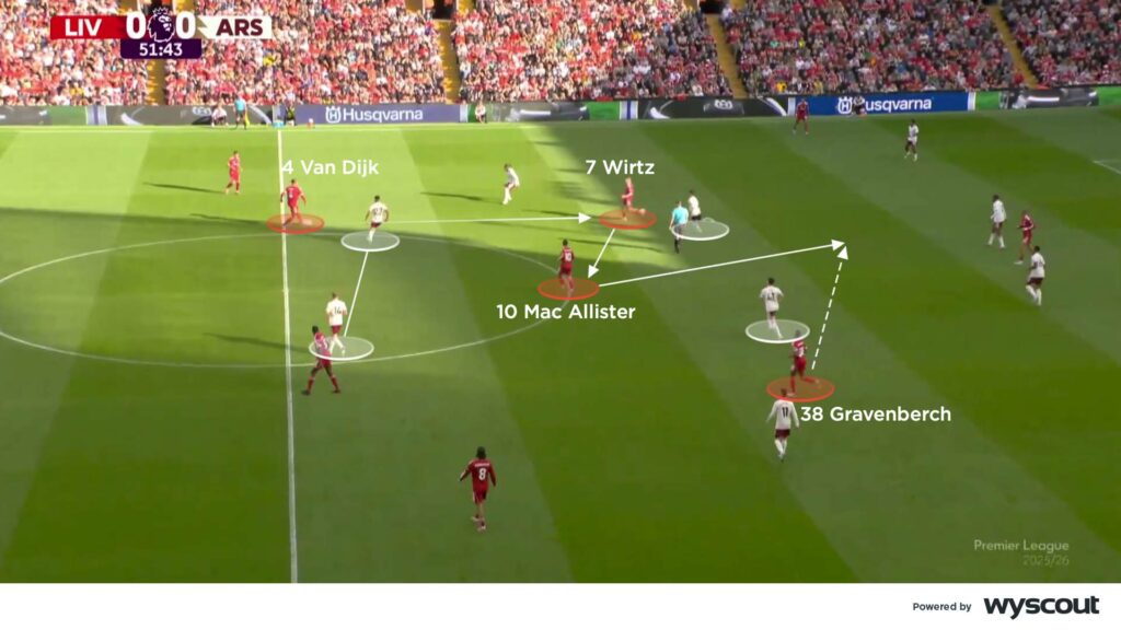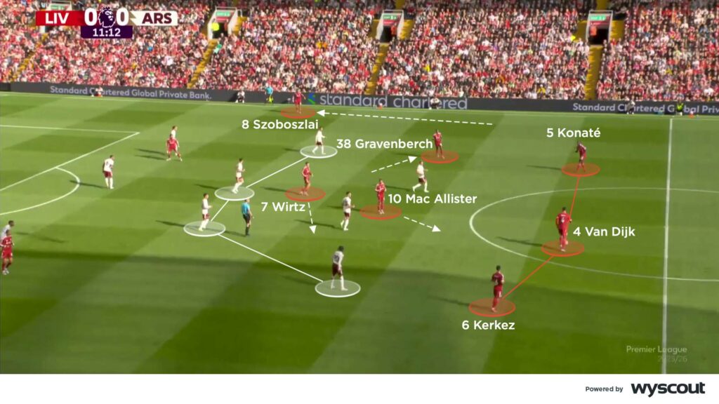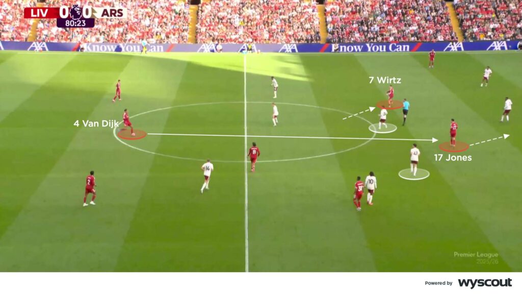 Although it was an outstanding long-range free-kick from Szoboszlai that won Liverpool the match, the move leading up to the foul illustrated their improvement at breaking lines. With more midfielders higher and operating on the shoulders of Arsenal’s two central midfielders, penetrative Liverpool passes found them on the half-turn. Sometimes Liverpool exploited gaps between Arsenal’s wide midfielder and central midfielder by playing inside-channel passes. In the lead-up to the goal, however, it was the central gap between Rice and Zubimendi that was too big. Virgil van Dijk took advantage with a pass through the centre into the feet of substitute Curtis Jones (on for Mac Allister), who was on the turn to play forward. With Zubimendi the wrong side, he ended up fouling Jones for the free-kick that Szoboszlai punished.