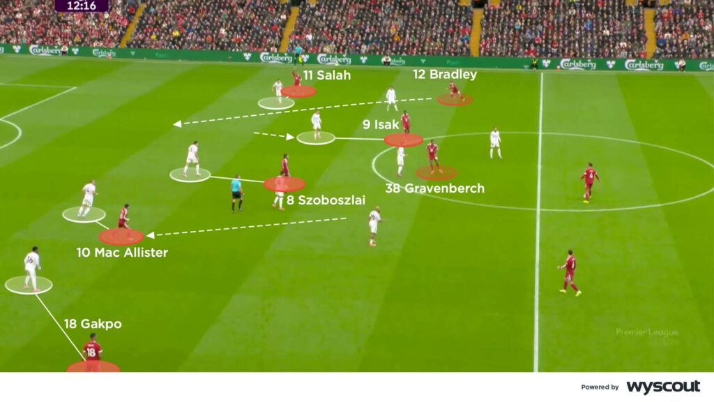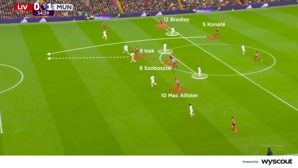 Alexis Mac Allister moved forward in the attack from Liverpool’s initial 4-2-3-1. joining Dominik Szoboszlai and Alexander Isak between the lines. The latter often shifted across to attack against left centre-back Luke Shaw. Gakpo and Mohamed Salah, meanwhile, held the width so that Liverpool had five players placed on Manchester United’s back line. However, only Liverpool’s full-backs initially made attempts to threaten in behind (as with Conor Bradley, below). They were rarely found by their deeper teammates, though.