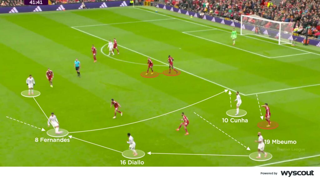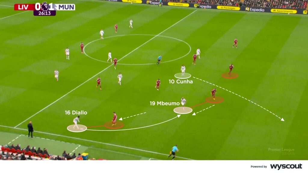 The visitors took an early lead when Mbeumo was slipped in behind by Amad Diallo, and they continued to try to exploit via their right side throughout the first half. As Slot explained, United played relatively direct and, although they rarely won the first contact, their midfield unit and back line regularly secured the ball high on the next phase of play. From there, they searched for their right side as early and as often as possible. Wing-back Diallo was positioned a little deeper when receiving, to draw out Liverpool left-back Miloš Kerkez. This meant Virgil van Dijk and Ibrahima Konaté were forced to cover across more than they may have liked, as Mbeumo and Matheus Cunha made clever movements in the inside channels (below).
