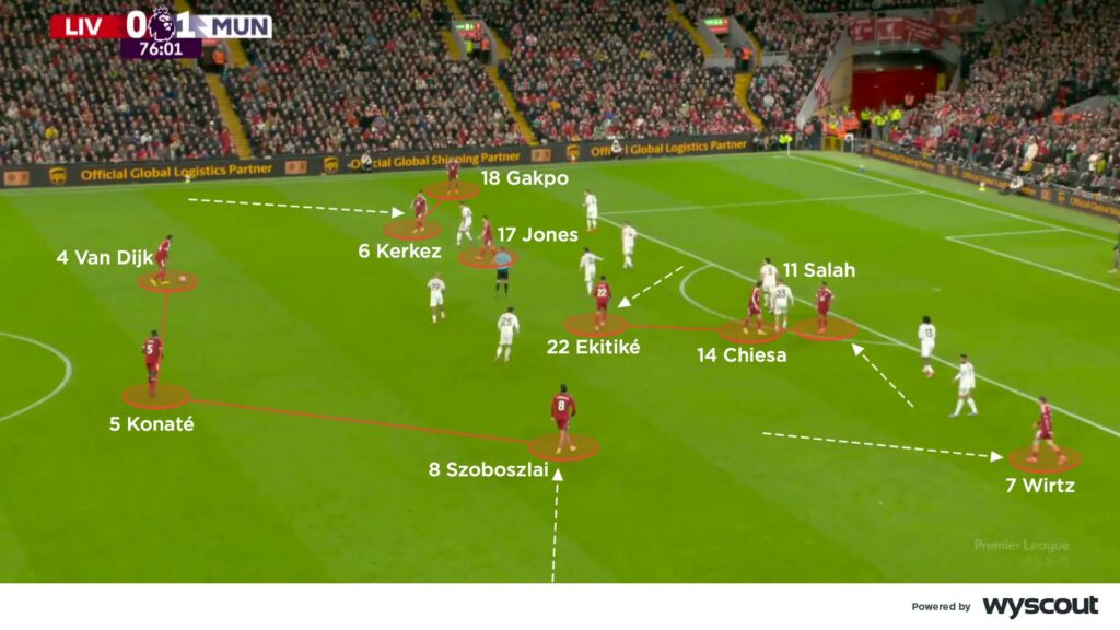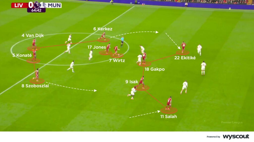 With Liverpool making no real attacking advances in the first 15 minutes of the second half, Slot made a triple change. Curtis Jones, Florian Wirtz and Hugo Ekitiké were introduced on 62 minutes for Conor Bradley, Ryan Gravenberch and Mac Allister. Liverpool then converted into a 4-2-4 shape, with Jones and Wirtz as an unlikely pairing in the centre of midfield. When their narrow front line surged forward, Liverpool’s full-backs also looked to join the attack, at times supported by the two midfielders. Liverpool then had lots of runners going forward (below), sometimes outnumbering United’s back five.