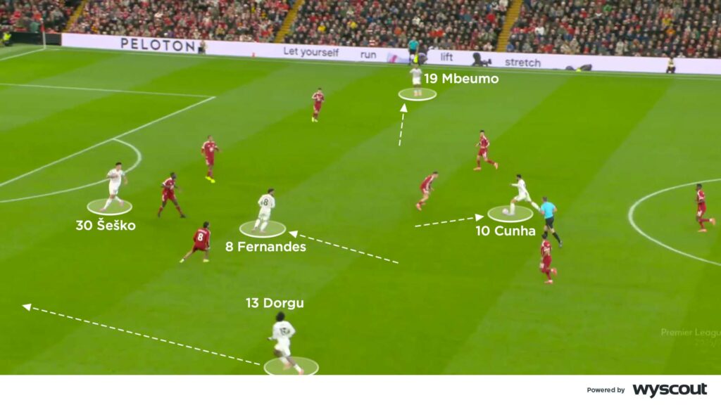 With Casemiro and Diallo cautioned, Amorim chose to add Patrick Dorgu as a left wing-back and Benjamin Šeško as the main centre-forward. Diogo Dalot attacked as right wing-back, but was more cautious with his runs forward, allowing Mbeumo to attack wider and isolate Kerkez 1v1. A deeper Cunha worked well with Fernandes, rotating between the lines to support Šeško, as well as Dorgu’s runs from deep on the left (below), as United went toe-to-toe with Liverpool for a period.