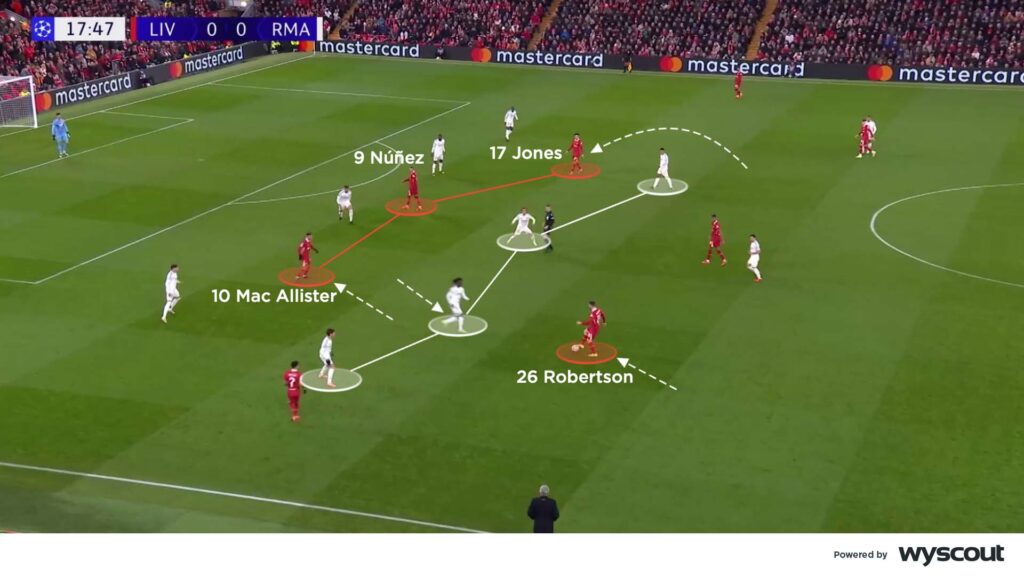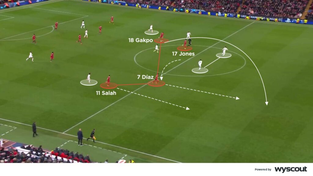 Ancelotti’s changes helped Madrid have more of the ball, while placing more players in higher and more effective positions. On the flip side, they were more susceptible to counter-attacks against a Liverpool side that was a major transitional threat, flying forward from deeper regains in their 4-1-4-1 block. Jones’ was full of running and energy from midfield, joining the front trio of Gakpo (on for Núñez after 68 minutes), Luis Díaz as the number nine, and Salah (below).