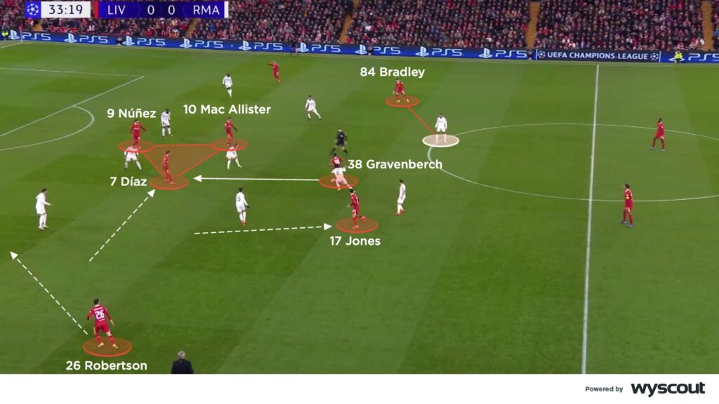 The home side’s central-combinations continued throughout the first half, with Thibaut Courtois forced to make multiple saves. Luis Díaz moved centrally from a wide-left starting position, working off dropping movements from Mac Allister or Jones. This ensured that Darwin Núñez always had two teammates close by, to link and create with. Luis Díaz’s movement also allowed Andy Robertson to push forward from left-back, with right-back Conor Bradley much more reserved in the first half – likely wary of Mbappé’s counter-attacking potential.