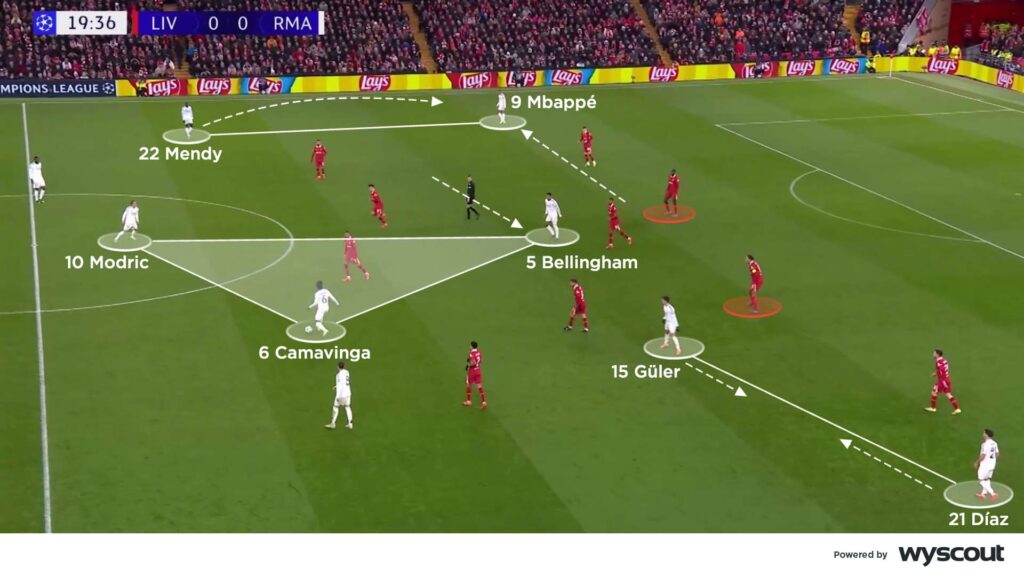 By contrast, Madrid had few central threats. From their 4-4-2 defensive shape, Mbappé moved wide-left, supported by left-back Ferland Mendy’s runs from deep. Jude Bellingham was on the left of midfield when defending, but in possession moved central to create a midfield trio, ahead of Luka Modric and Eduardo Camavinga. Brahim Díaz and Arda Güler, meanwhile, worked off one another to combine in the right inside-channel. Despite all of these movements, Liverpool’s centre-backs often had no one to mark or track, and Madrid didn’t have a single attempt on target in the first half.