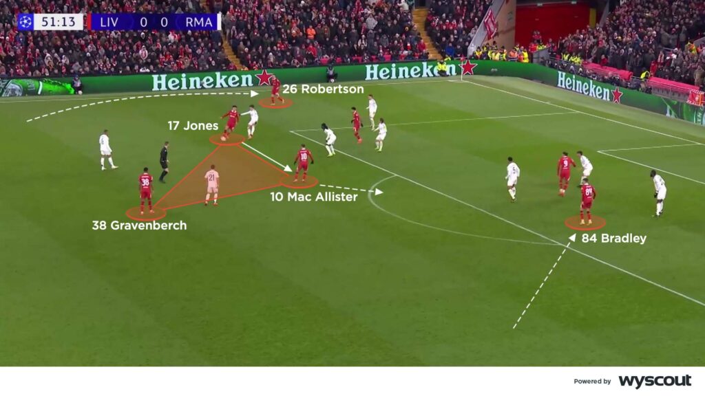 With their 4-3-3, Liverpool had both number eights – Mac Allister and Curtis Jones – positioned very high, aiming to receive in pockets of space between Real Madrid’s full-backs and centre-backs. When Liverpool’s full-backs or Ryan Gravenberch stepped forward with the ball, they drew out one of Madrid’s midfield line, from the visitor’s 4-4-2 block. This created bigger spaces between the lines for Liverpool's narrow trio to combine, centrally, and attack the centre-backs (below).