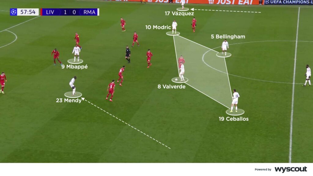 Within five minutes of Liverpool taking a 52nd minute lead, Ancelotti made two substitutions, bringing on Lucas Vázquez for Arda Güler, and Dani Ceballos for the injured Camavinga. Ancelotti’s changes gave Madrid a new shape, in which they had improved central connections (below). Vázquez moved high from right-back, with Brahim Díaz wide on the left, supported by forward runs from Mendy, more often than not moving inside from left-back. Ceballos, Modric and Federico Valverde were back in central midfield, while Bellingham occupied and rotated through the central areas, giving them a much better platform to break Liverpool’s defensive shape. They won a penalty soon after, only for Kelleher to save Mbappé’s effort.