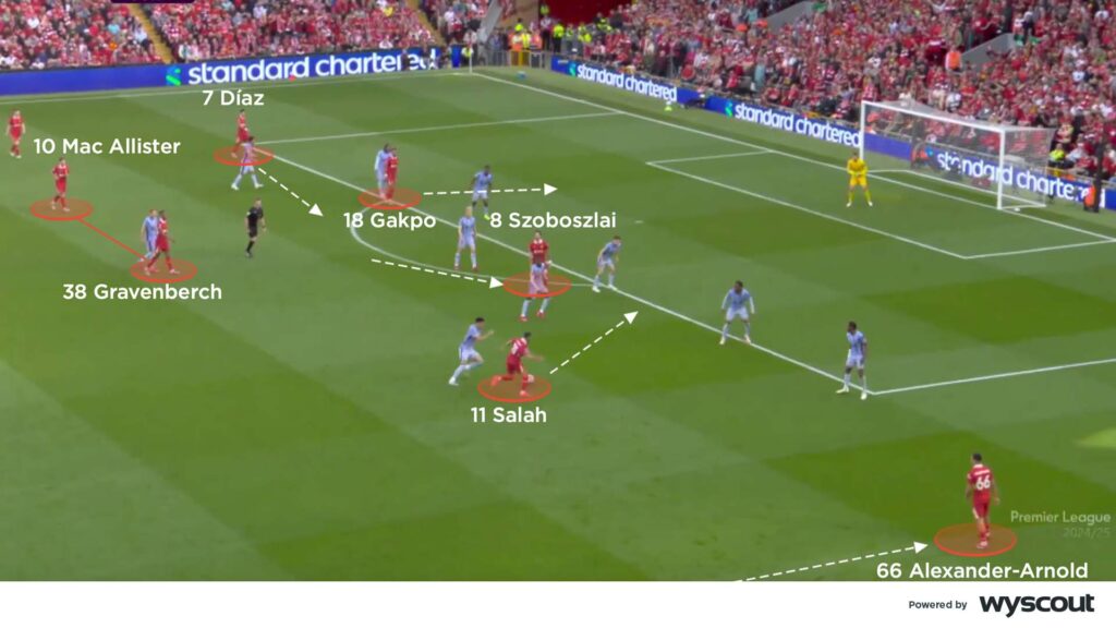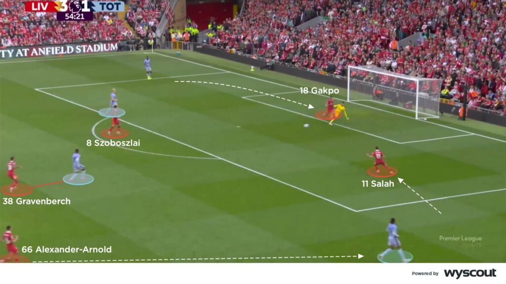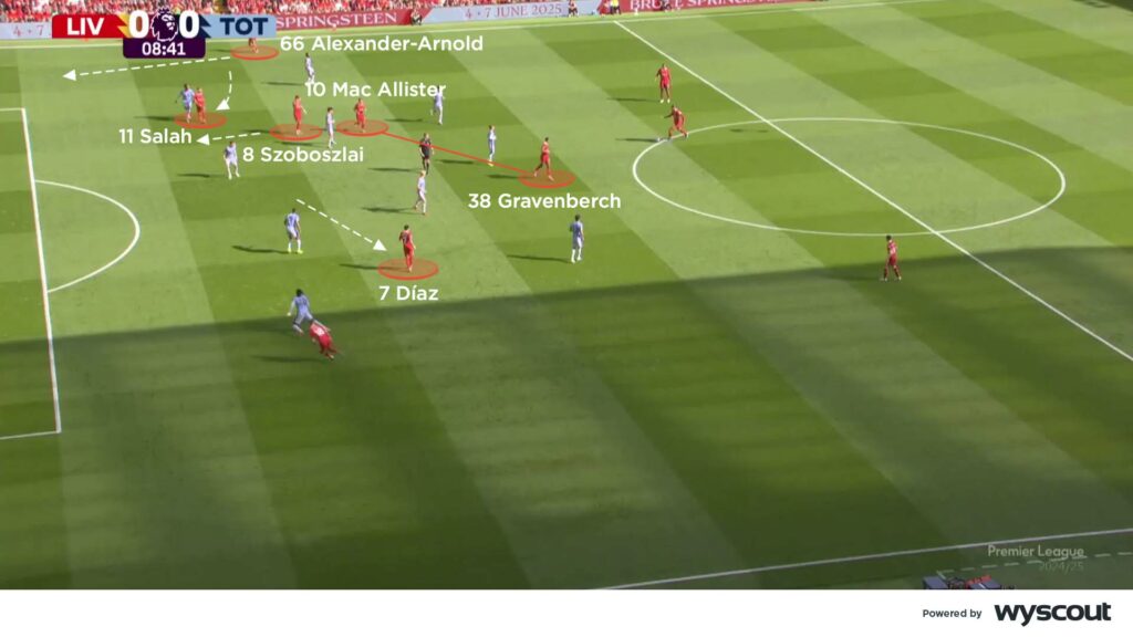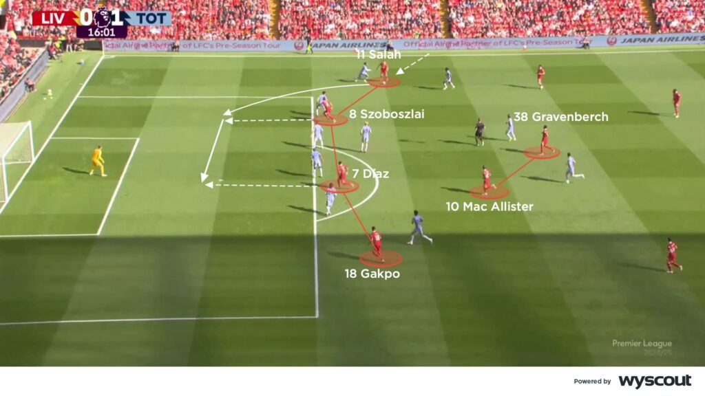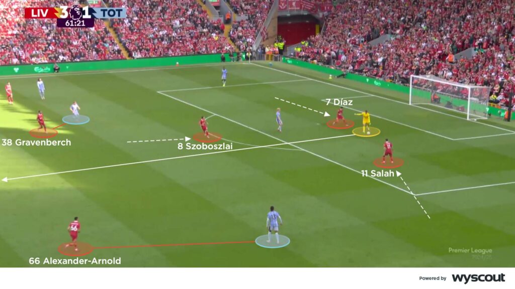 With their attacking waves, Liverpool put numbers between Tottenham’s lines. The home side formed an adapted front line of four, with Szoboszlai repeatedly joining the attack. This was too much for Tottenham as Liverpool continued to exploit the space inside Udogie, not least with their opening goal. Salah’s dribbles inwards worked the ball into dangerous areas, with Szoboszlai adapting his positioning to run beyond to receive (below), when appropriate. Szoboszlai’s low driven cross found Díaz to convert, as the central rotations and movements in the right inside channel helped Liverpool to repeatedly attack. Ryan Gravenberch and Alexis Mac Allister also made forward runs, rotating when Szoboszlai dropped toward the ball.