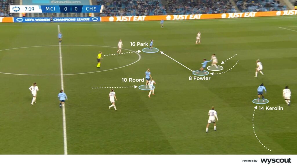 Manchester City utilised a 4-3-3 shape in the first half, with centre-forward Mary Fowler dropping to link with the midfield. Number eights Jill Roord and Jess Park looked to get forward and support passes into Fowler, especially when she pulled one of Chelsea’s centre-backs out of line (below). From the right, this central pattern of movement was also supported by inward runs from winger Kerolin, who provided another passing option for Fowler as she dropped towards the midfield.