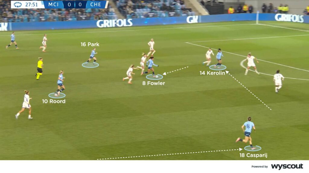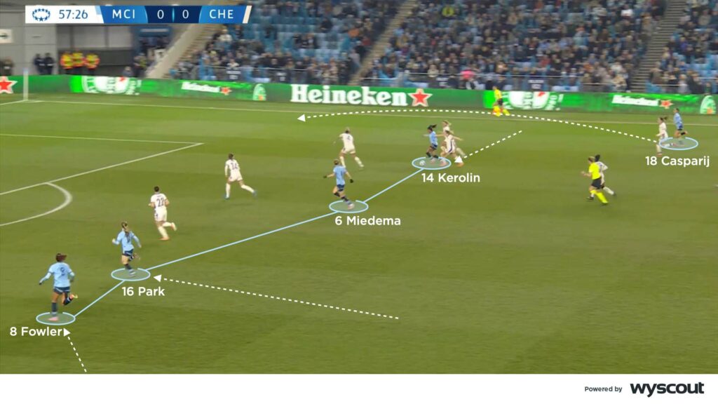 Although they had much less of the ball, City created more attempts on goal in the first half than the visitors. Fowler’s dropping continued to trouble Chelsea’s double pivot, as Kerolin began to move well inside from the right. Full-back Kerstin Casparij started to advance forward more, which wasn’t always tracked by Chelsea’s Lauren James. When Chelsea’s back line narrowed to block central attacks and movements, Casparij then found herself in positions to cross. With City attacking from wide right as well as the centre, Fowler’s dropping movements remained key.