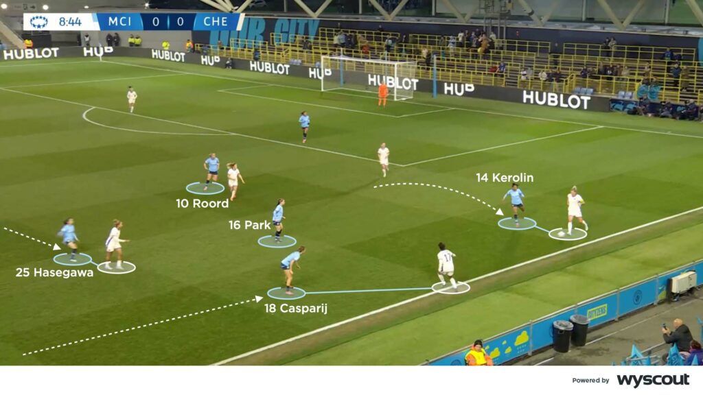 As well as their central combinations, City created chances from their high pressing – especially early in the first half. From their right side, Kerolin looked to jump on to left centre-back Millie Bright, especially when Bright widened to receive. City’s Casparij then pressed from full-back to full-back, and once the wide trap was set number eights Roord and Park looked to close off passes into Chelsea’s double pivot. Yui Hasegawa then moved across to deal with James’ inverted movement, covering the space behind Casparij’s jump forward (below).