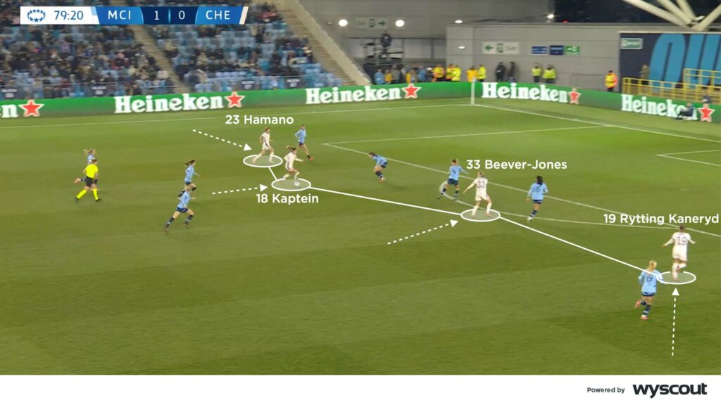 Chelsea also looked to place four narrow attackers against the City back line in the second half. Beever-Jones was moved to a more central role, supported by Wieke Kaptein (on for Macário). Johanna Rytting Kaneryd (on for James) and Maika Hamano (replacing Ramírez) attacked the inside channels with dribbles inside, but also direct runs across goal, working as closely to Beever-Jones and Kaptein as possible (below). As such, Chelsea managed to break between the lines much more in the second half, working central combinations and increasing their efforts on goal. Bompastor’s team had one disallowed for offside, then Rytting Kaneryd hit the crossbar, but they couldn’t get a name on the scoresheet.