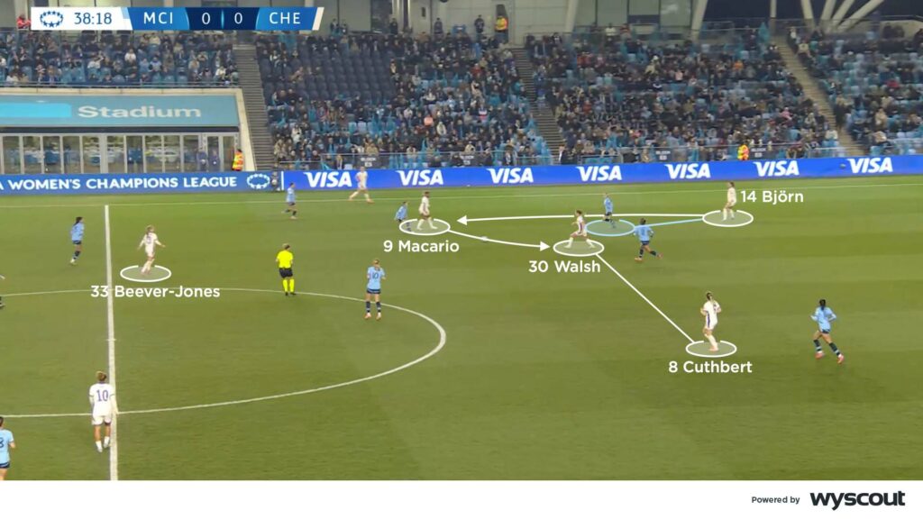 Chelsea eventually found a solution to this press, building more on their right side and avoiding City’s pressing trap around Bright. As a result, City’s left-sided number eight, Park, released on to Nathalie Björn, which often left a Chelsea pivot free. As long as Chelsea had a passing option to bounce back, or play around the corner into the free pivot, they could then progress forward. This combination on Chelsea’s right began to find winger Aggie Beever-Jones, as well as widening runs from centre-forward Mayra Ramírez, and switches into the tricky left pair of James and Sandy Baltimore. Although Chelsea struggled to create attempts on goal, this did mean they nullified City’s press with an improved build phase, particularly on their right side.